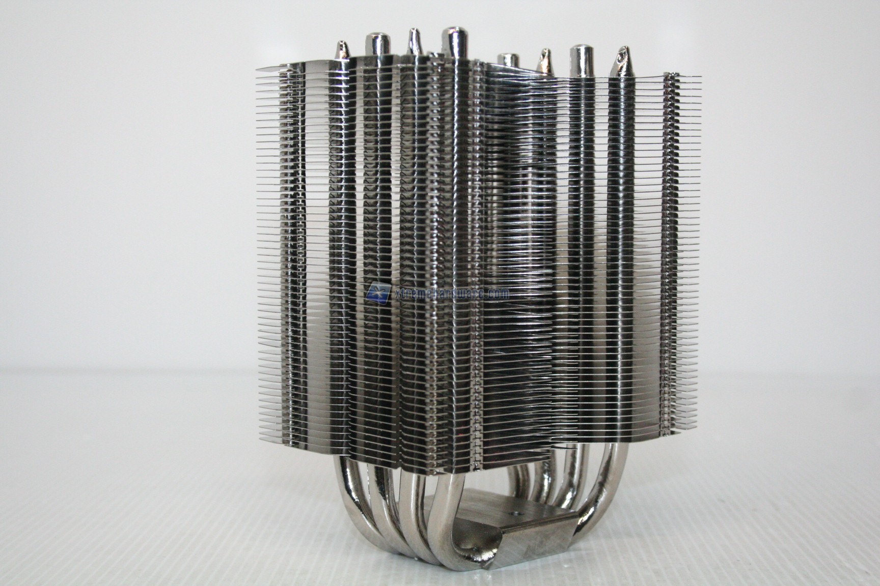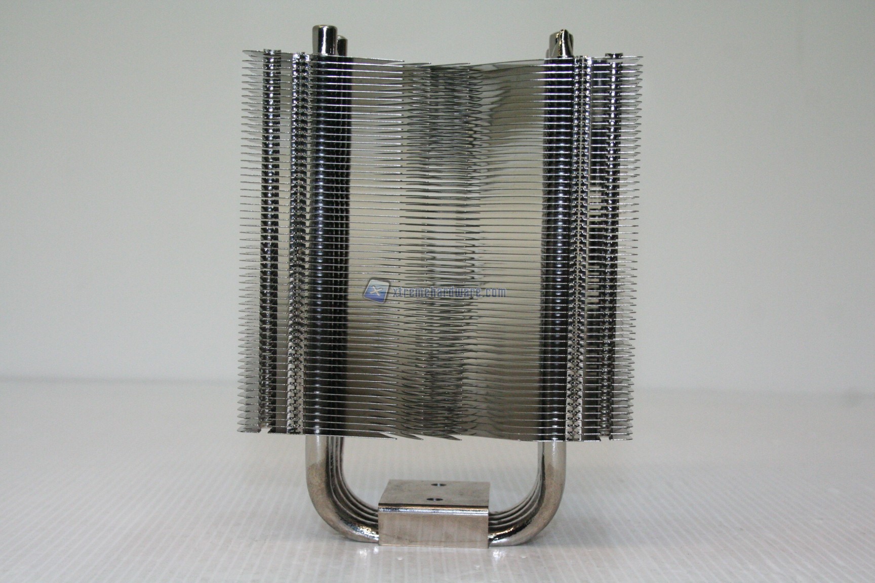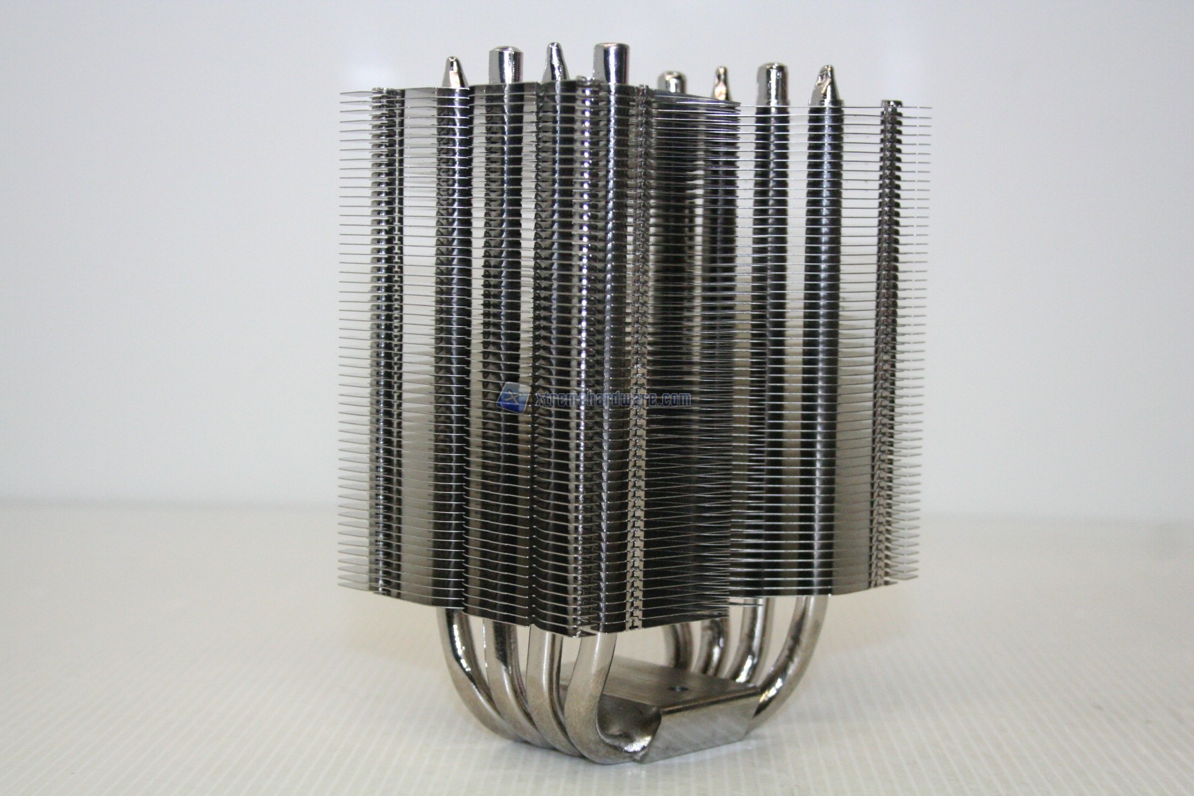 La scudatura finale delle heatpipes è egualmente valida e presenta una configurazione stock Push, anche se purtroppo non è possibile aggiungerne una seconda posteriormente, per via dell’assenza dei fermi nel bundle, similmente al Themis. E’ un modello orientato a gestire una CPU con frequenze medio-alte, con overclock moderati qualora si volesse mantenere una buona silenziosità, ma anche overclock elevati accontentandosi di una soluzione più rumorosa. La superficie dissipante comincia ad essere importante e quindi non ci saranno problemi per la gestione di CPU potenti, con TDP nell’ordine dei 130/160W.