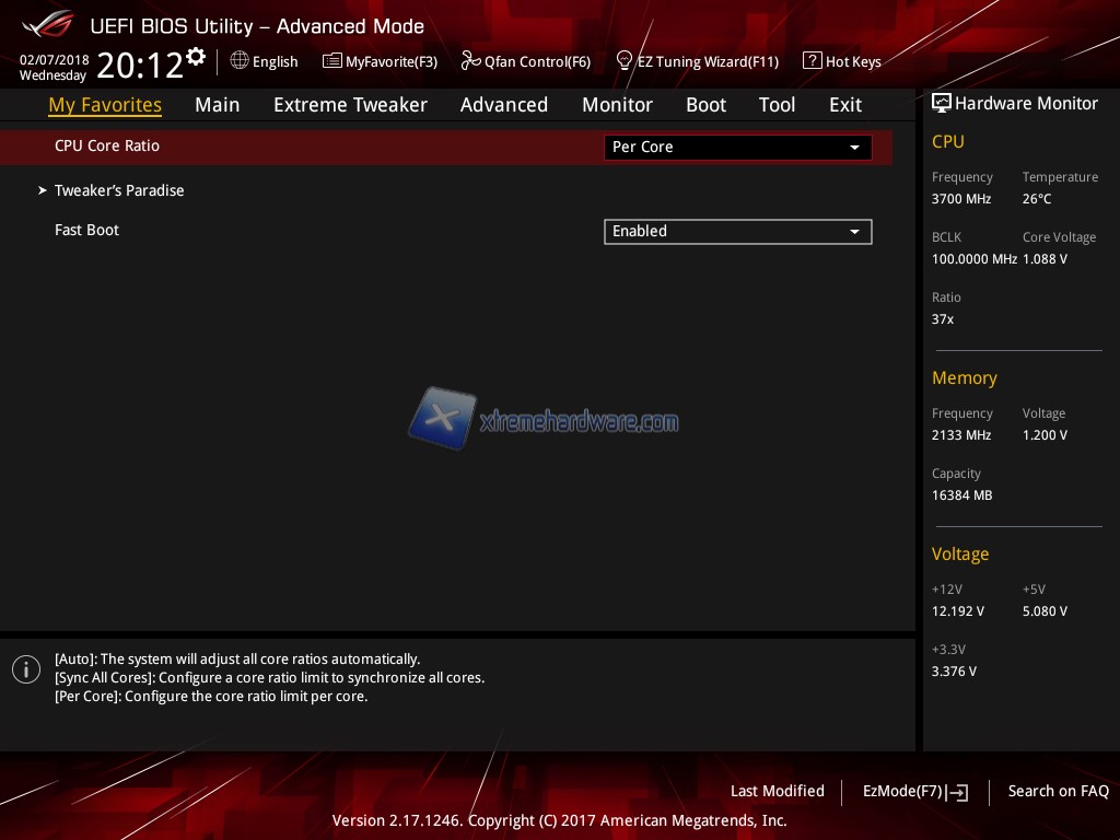 Per passare alla modalità ‘’Advanced Mode’’ ci basterà premere il tasto F7. Fatto ciò ci troveremo di fronte ad un'interfaccia grafica stile ROG dei suoi BIOS UEFI. Al solito i Menù principali sono 8 e sono ‘’My Favorites’, ‘’Main’’, ‘’Extreme Tweaker’’, ‘’Advanced’’, ‘’Monitor’’, ‘’Boot’’, ‘’Tool’’, ed infine ‘’Exit’’. Nel primo Menù ovvero ‘’Main’’ avremo un riassunto sul tipo di processore installato e la quantità e frequenza attuale dei moduli RAM installati nonché altre informazioni base. Non manca la voce ‘’My Favorites’’ dove potremo salvare eventuali impostazioni e profili di OC.