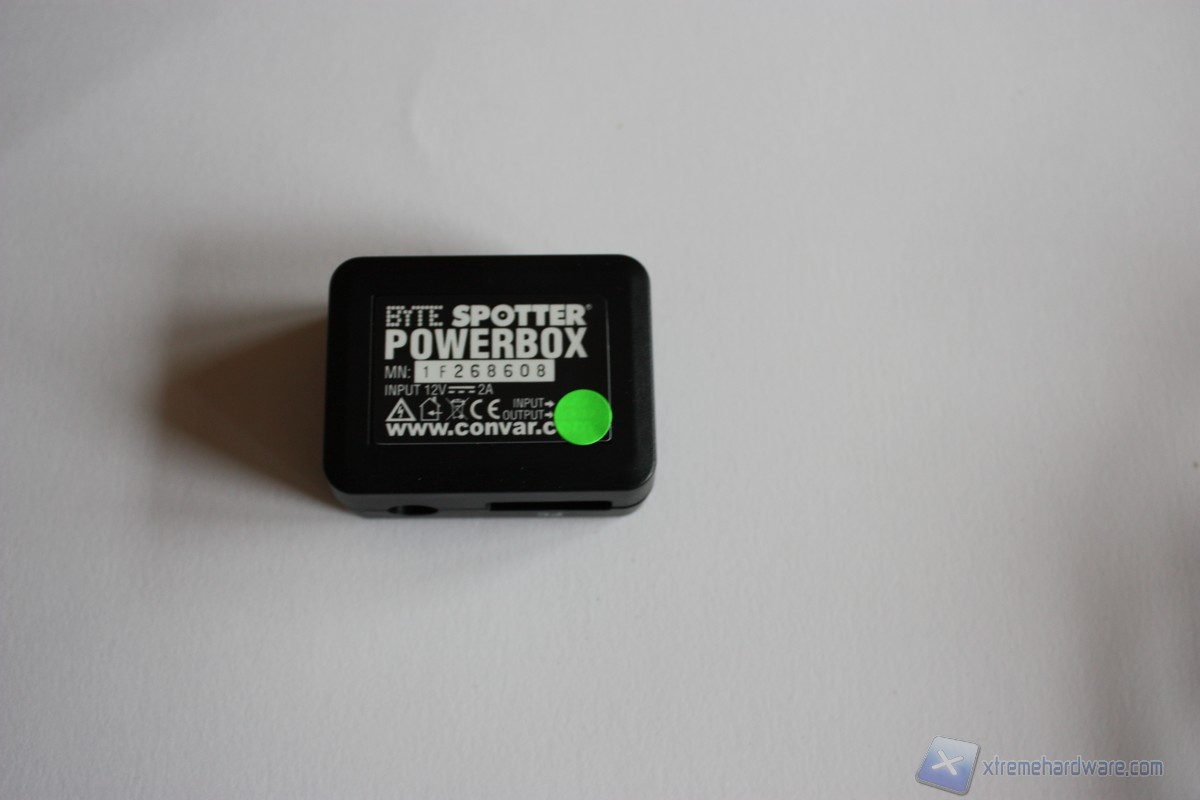 Il Byte Spotter Power Box, che altro non è il fulcro di connessione tra il box e il computer. Il Byte Spotter Power Box è un box di ridotte dimensioni di colore nero che presenta ad un'estremità il jack al quale va collegato l'alimentatore supplementare per alimentare gli Hard Disk e un ingresso e-Sata che farà tramite il cavetto apposito e-Sata a USB per il collegamento al computer. L'altra estremità, invece, è caratterizzata solamente da un ingresso e-Sata (anche qui) che servirà a collegare l'adattatore alimentazione e dati al retro degli Hard Disk. Su di esso sono riportati il part number, il voltaggio, la potenza a cui deve lavorare e il sito del produttore.