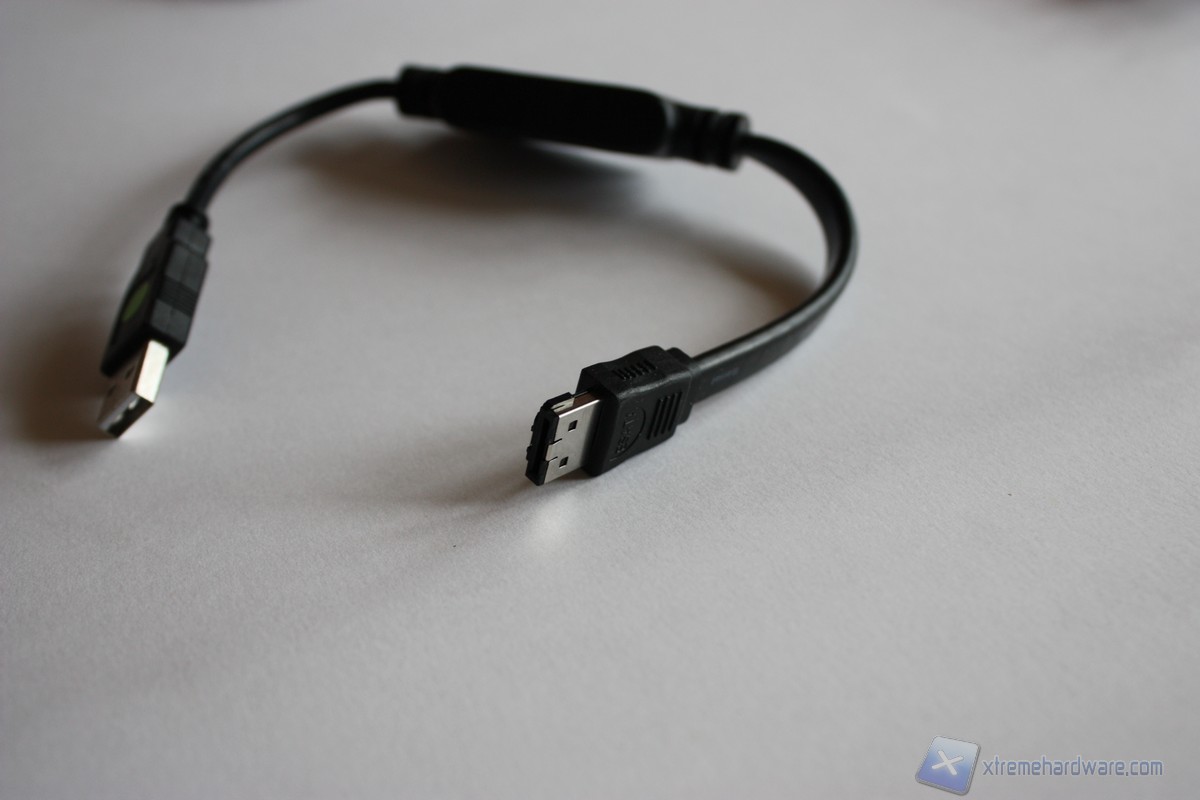 Ora passiamo all'adattatore Sata-alimentazione a e-Sata. Caratterizzato da un cavo lungo circa 30 cm in materiale plastico nero molto flessibile. Troviamo ad un'estemità la porta e-Sata da collegare al Byte Spotter Power Box mentre all'altra, come accennato prima, gli ingressi per il connettore Sata e di alimentazione degli hard disk ormai standard diffuso.