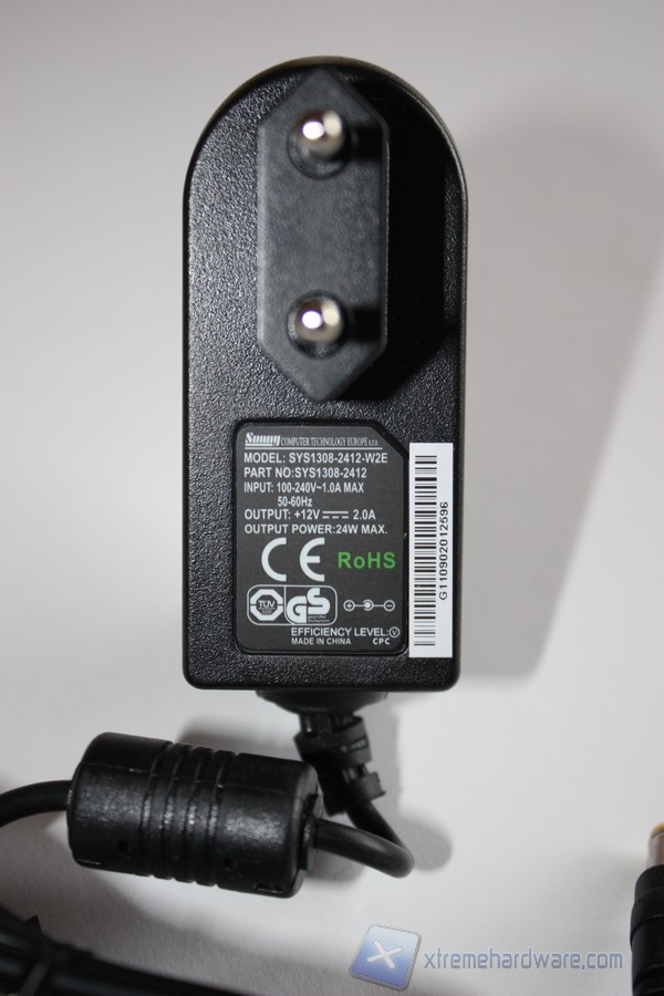 Infine analizziamo l'alimentatore, questo è essenziale per alimentare tutto il collegamento dei Bytepac al computer. L'alimentatore è realizzato in materiale plastico molto solido con un cavo di collegamento di circa 50 cm. E' dotato anche di un nodo in ferrite rivestito di materiale plastico per prevenire da interferenze elettromagnetiche e stabilizzare la corrente passante. L'alimentatore è prodotto dall'azienda ceca Sunny con sede a Brno. Sono riportati su di esso il model e part number, i voltaggi ed amperaggi nonchè le tensioni di entrata e uscita. Non mancano un codice a barre su un adesivo e i loghi ROHS;CE,TUV e GS, enti preposti a testare l'affidabilità e il processo ecologico.