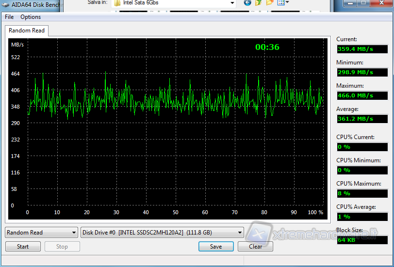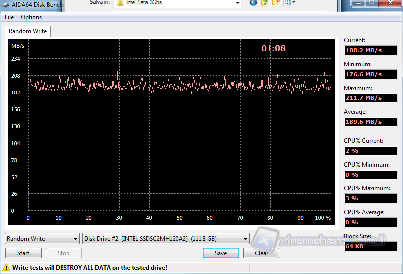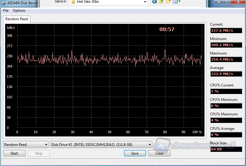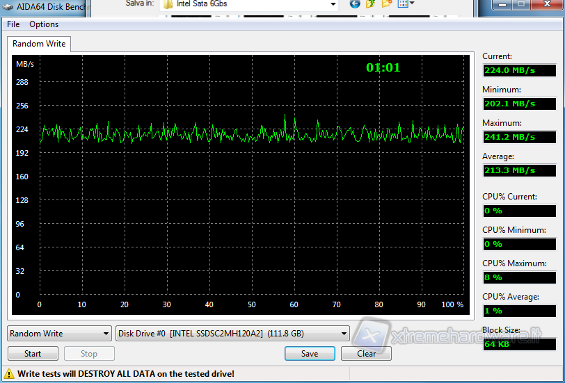 In questo test abbiamo potuto verificare le velocità del drive nella scrittura e lettura casuale (RANDOM) di blocchi di 64KB, con risultati che tendenzialmente ricalcano quanto verificato sino ad ora.